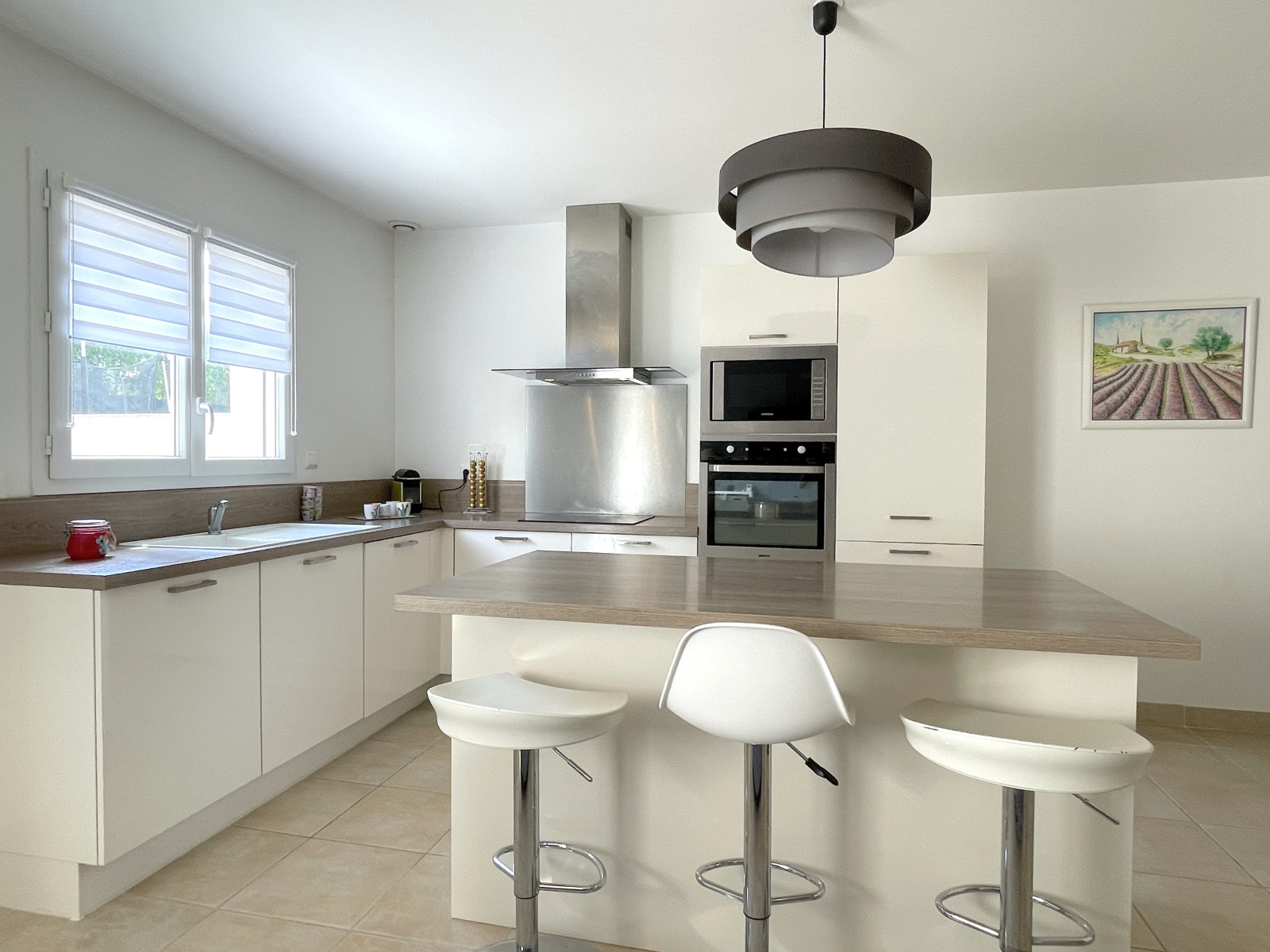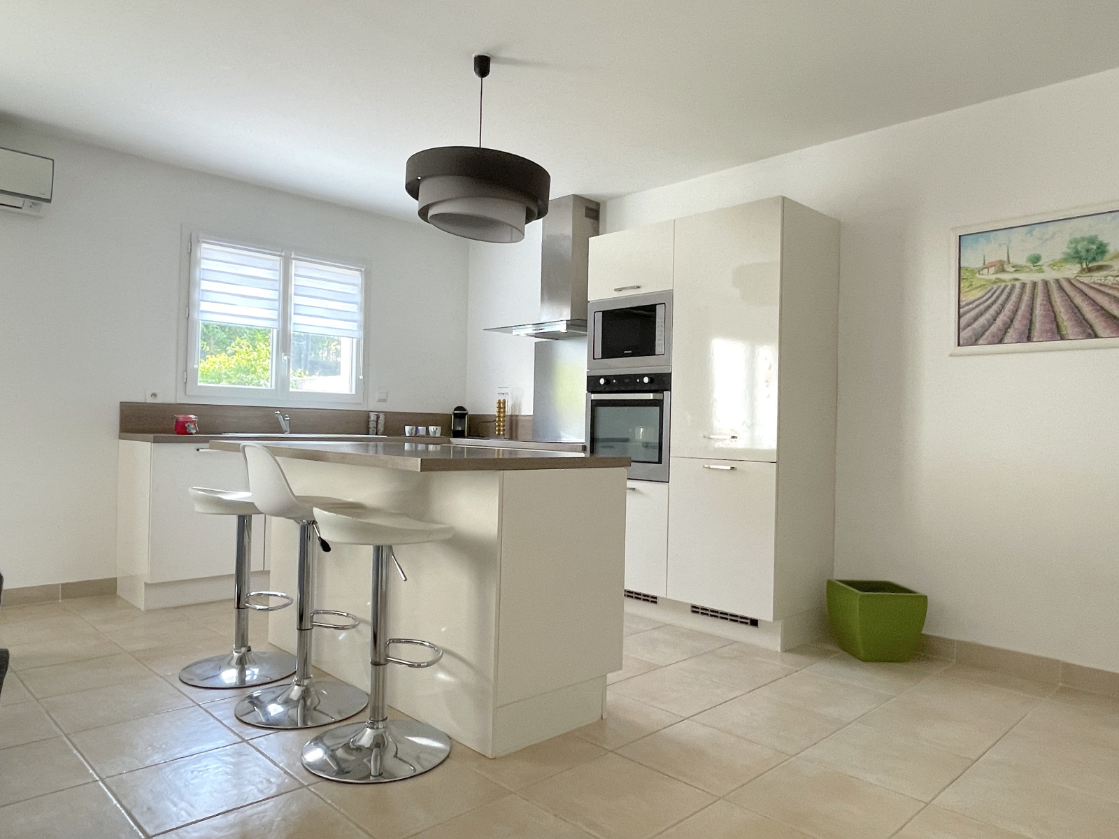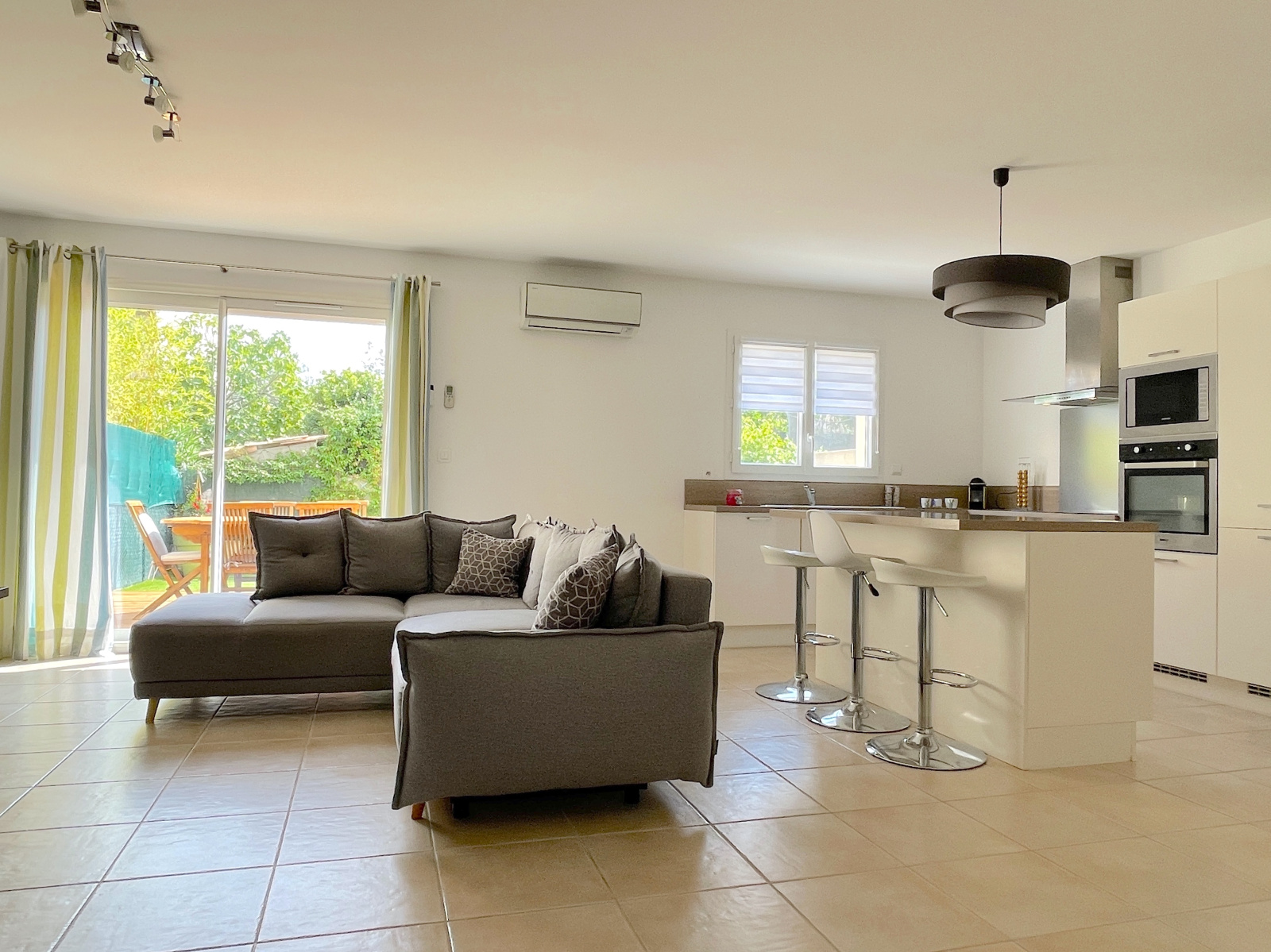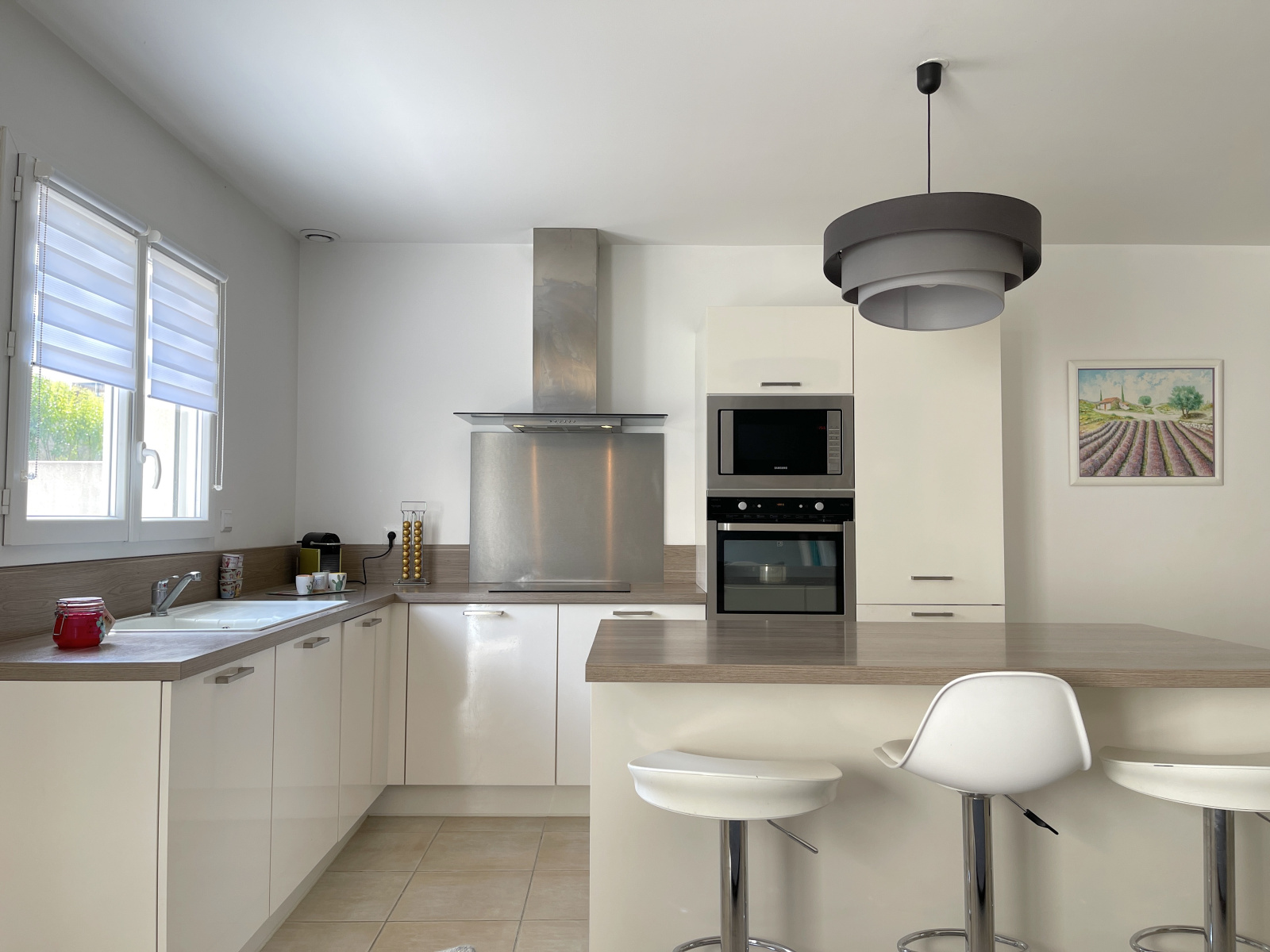 Dans un quartier résidentiel calme, cette villa de 2013 présente des prestations de qualité & des finitions soignées. Exposé Sud-Est, le séjour de 34 m2 dispose d'une cuisine américaine entièrement équipée. Il s'ouvre par une baie vitrée sur terrasse dinatoire de 23,32 m2 & jardin, sans vis-à-vis. Au rez de chaussée, on retrouve également un garage avec mezzanine de stockage. À l'étage, trois belles chambres avec placards, grande salle d'eau & WC séparés. Climatisation réversible, portail automatique.
