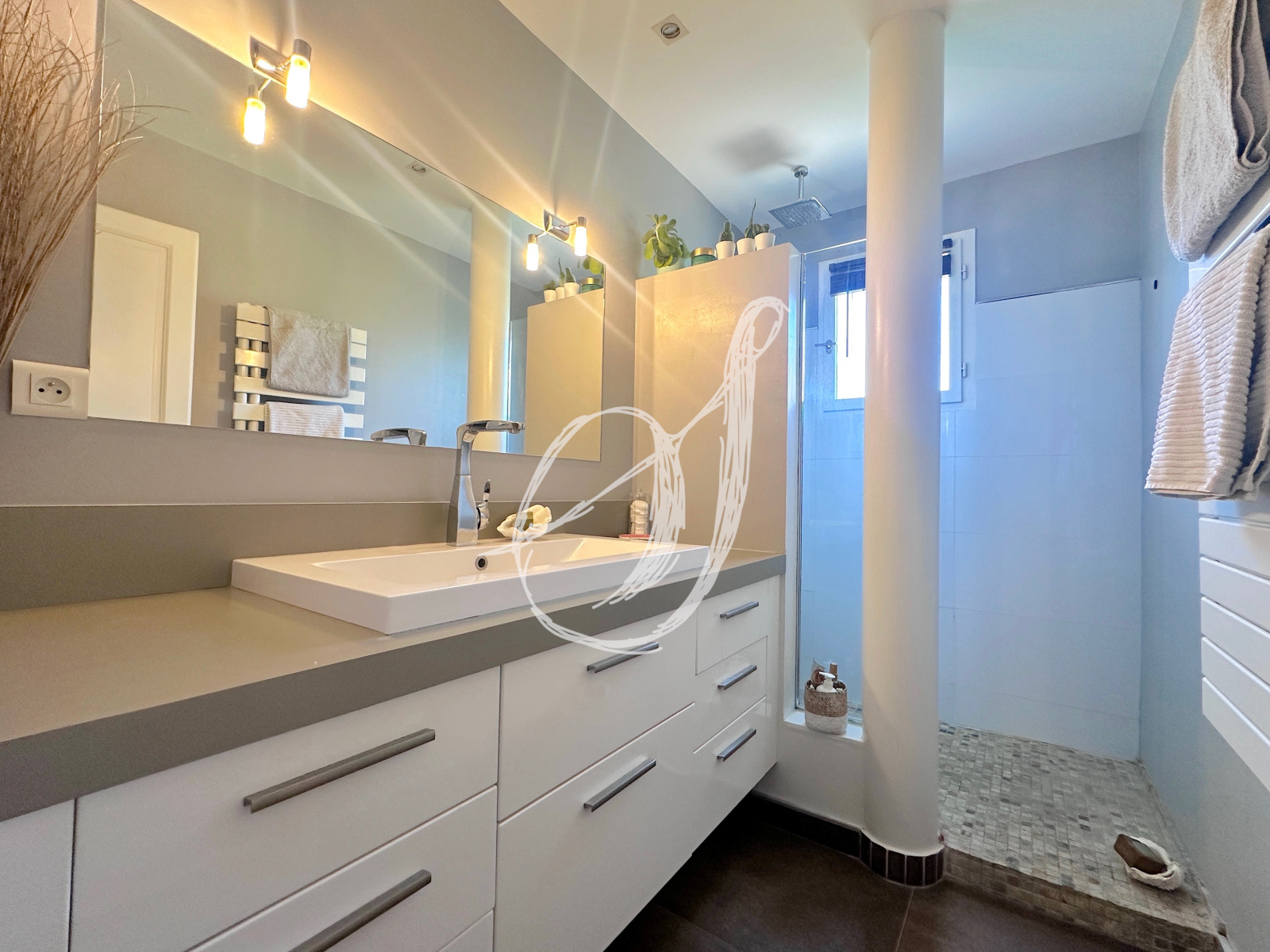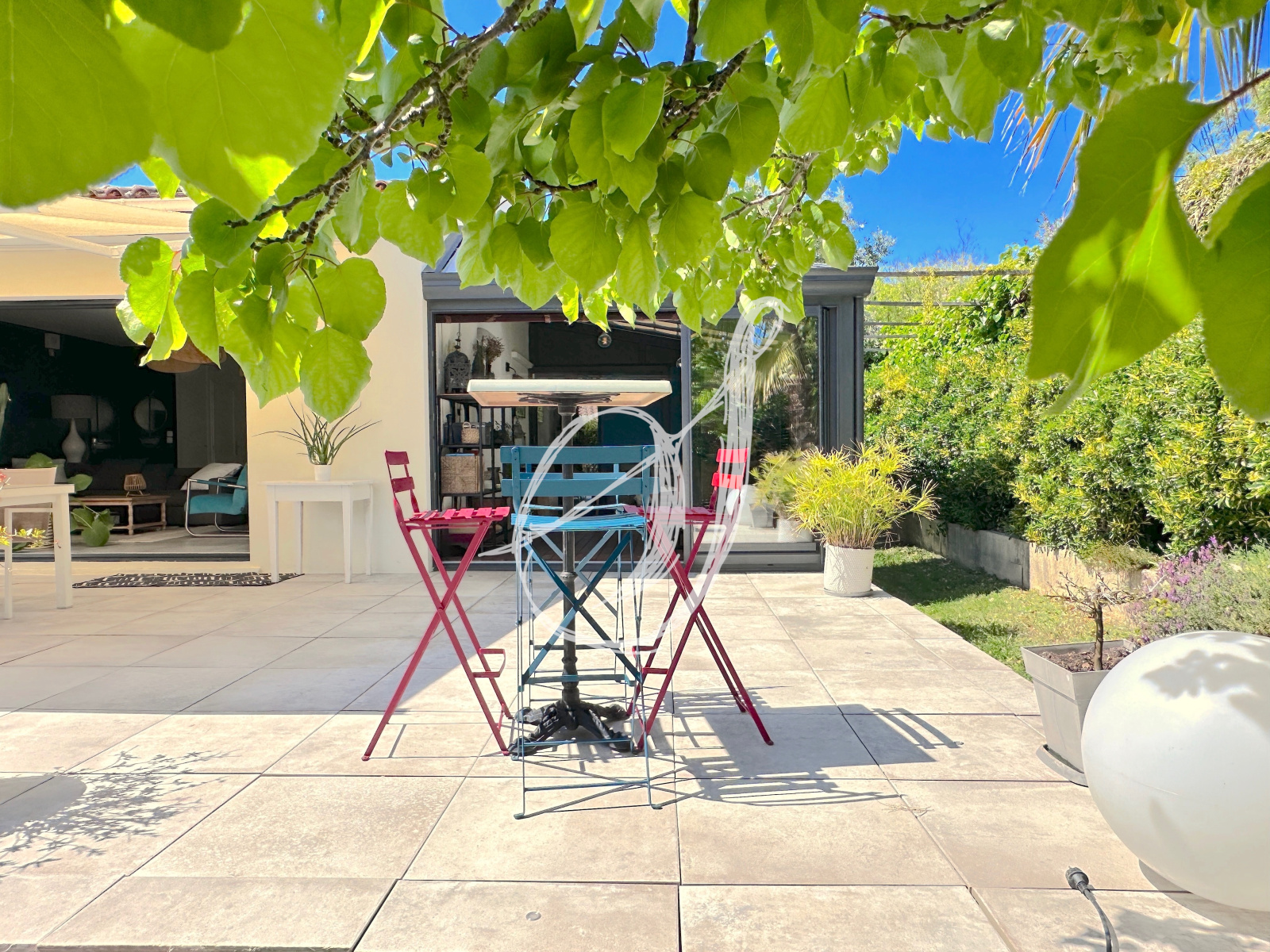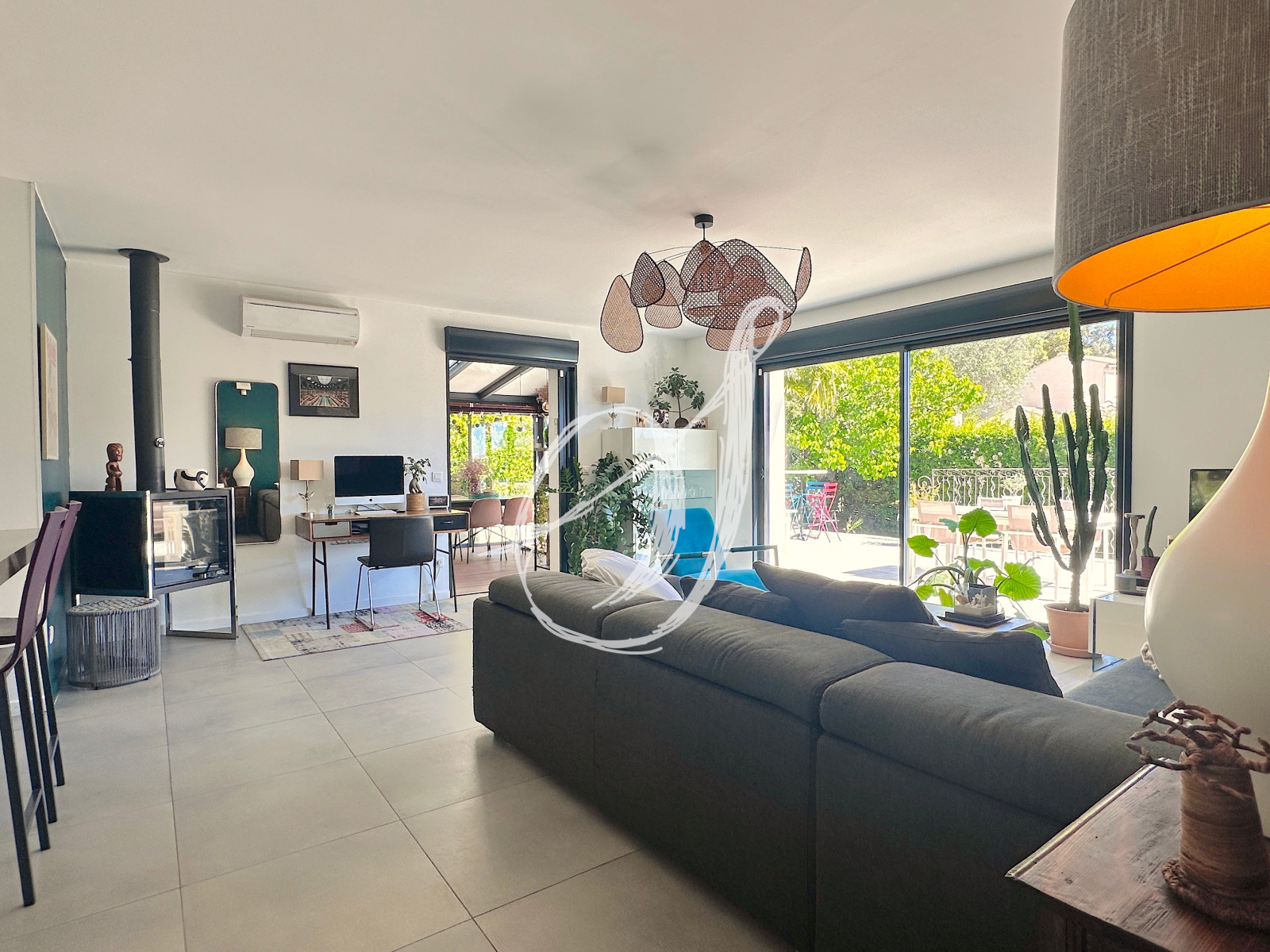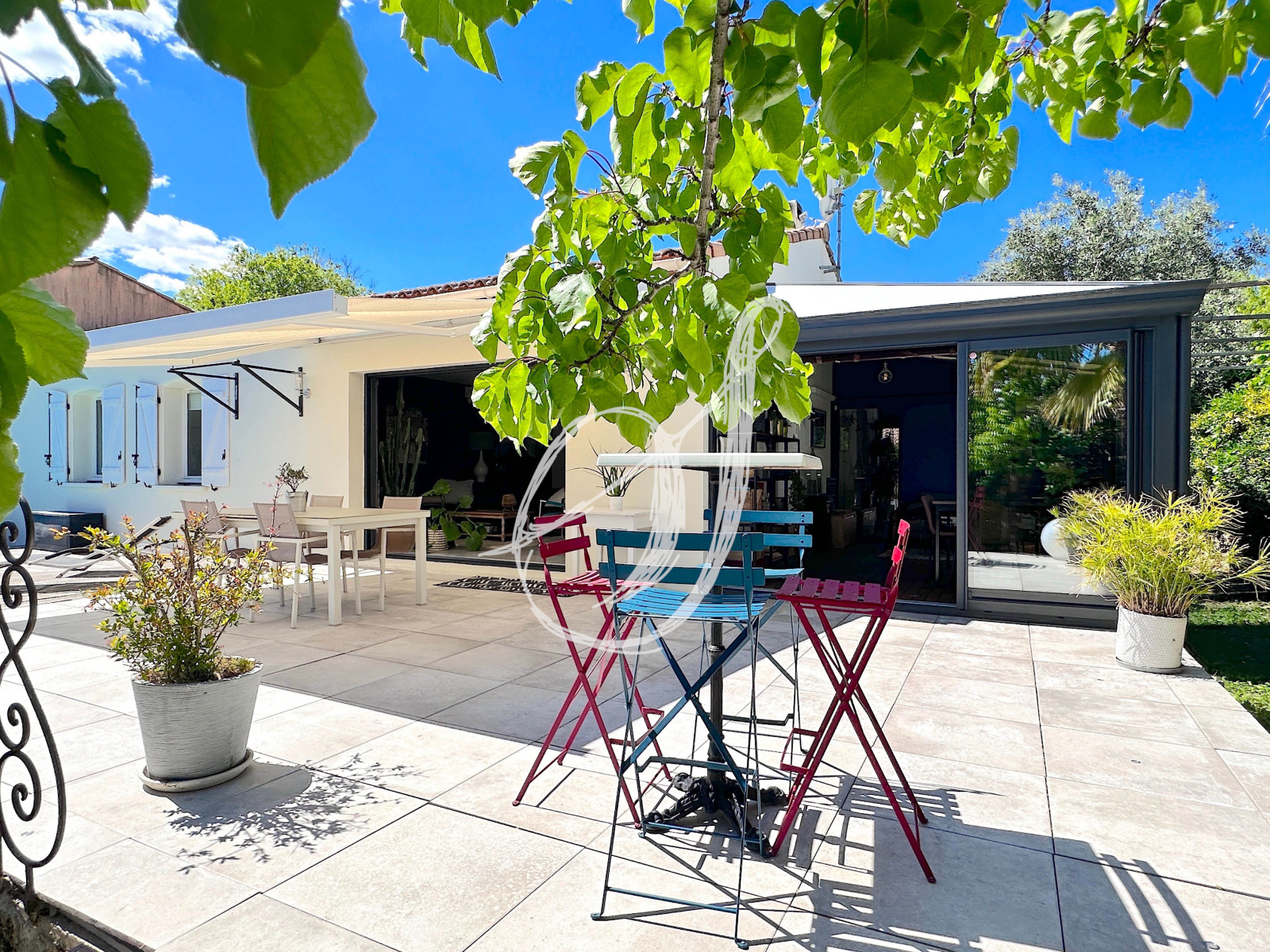 Dans un quartier résidentiel calme, en impasse, cette villa de plain-pied bénéficie d'un espace de vie de 57 m2 ouvert par une baie à galandage de 3 mètres sur terrasse & jardin. Dans la continuité du salon, la salle-à-manger entièrement vitrée dans un esprit atelier est bourrée de charme. Le jardin, sans vis-à-vis dispose d'une piscine équipée de nage à contre-courant. La partie nuit offre une suite parentale comprenant un dressing & un point d'eau privatif & deux autres chambres se partageant une salle d'eau. La villa dispose d'un garage & de deux emplacements de stationnement extérieurs. Un bien en parfait état d'entretien équipé de climatisation réversible & d'un poêle à bois.