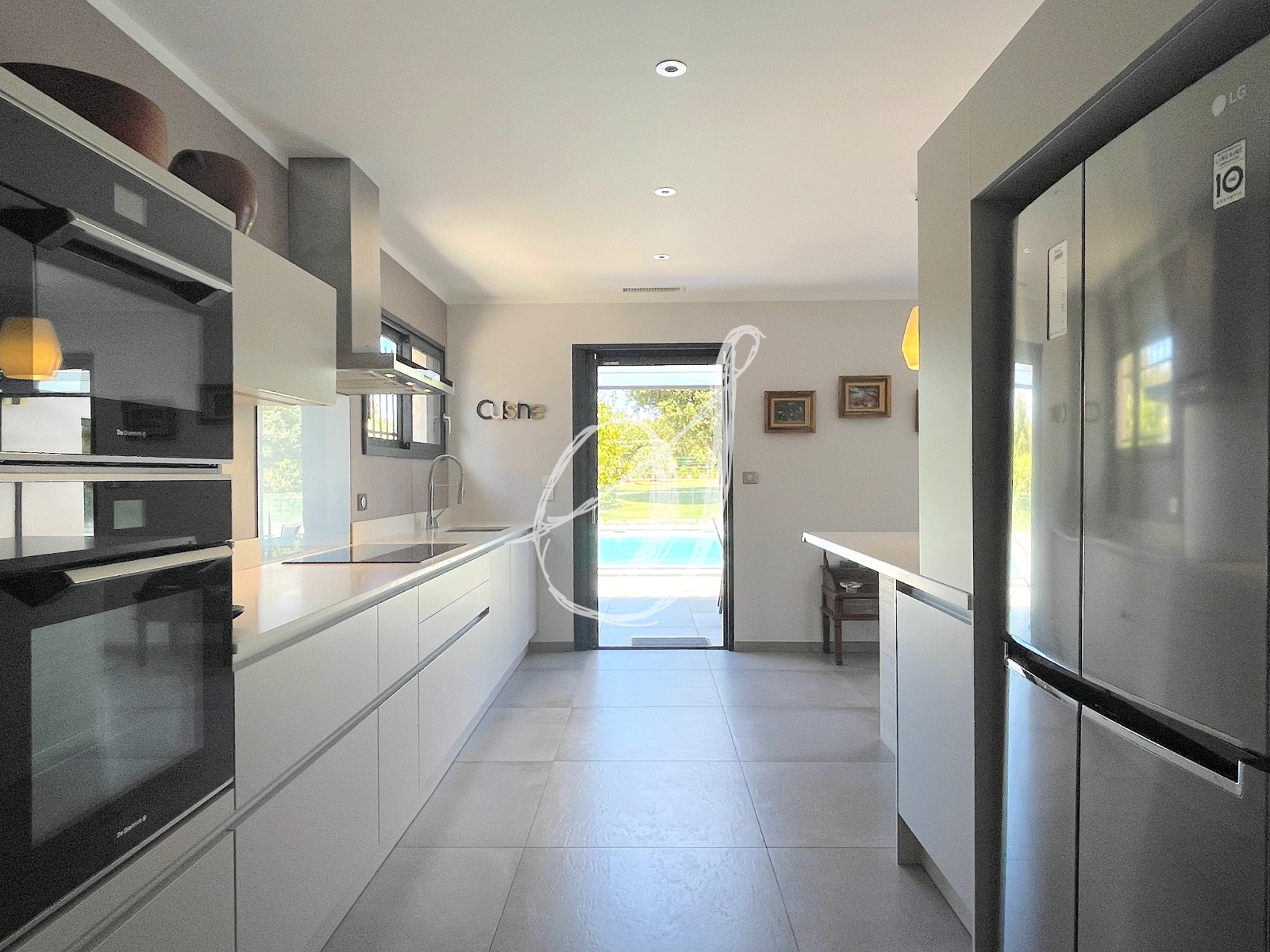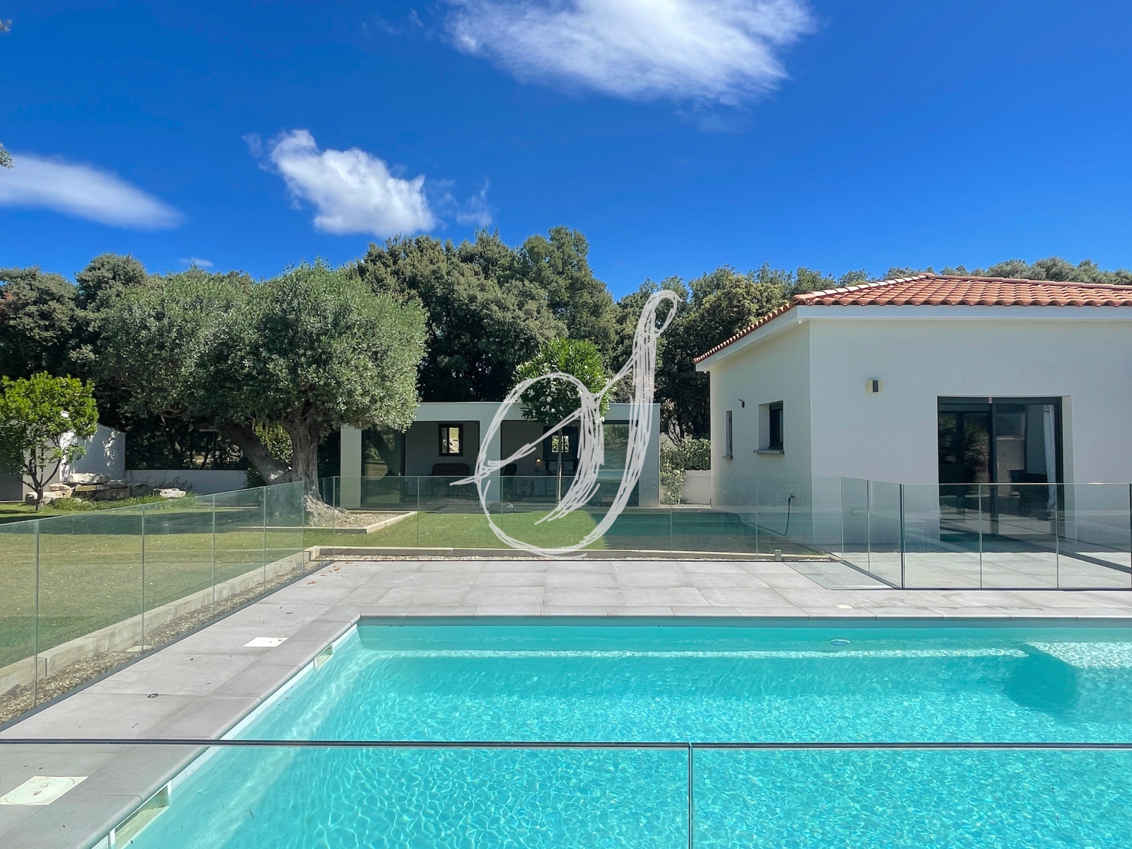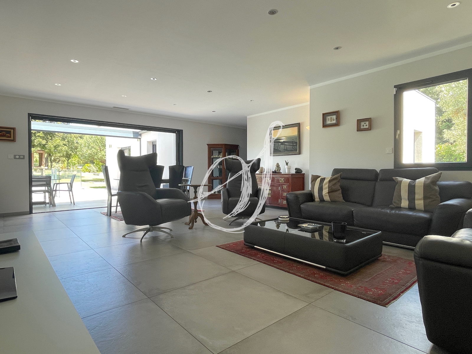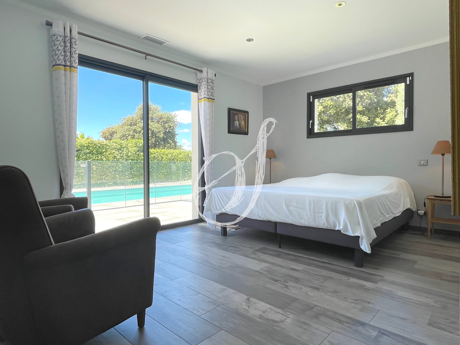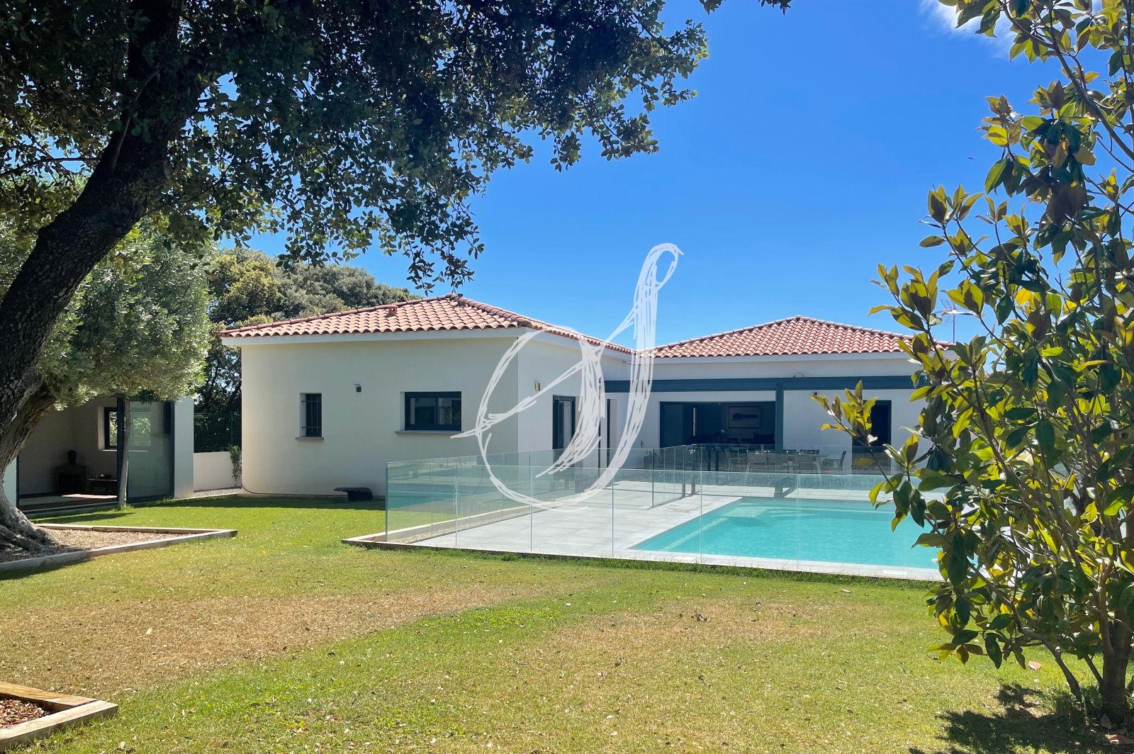 Des prestations rares pour cette propriété de standing, sur les hauteurs du village au calme. En bordure d'une zone naturelle protégée & non constructible, cette villa de 2017 labéllisée BBC & RT 2012 est entièrement de plain-pied. Son espace de vie de près de 60 m2 s'ouvre par une large baie à galandage sur terrasse, piscine & jardin entièrement paysagé. Bourré de charme, ce jardin mêle diverses essences nobles : oliviers centenaires, chênes verts, palmiers, jasmin du Japon... Le tout sans aucun entretien : arrosage automatique sur forage & robot tondeuse. Ce bien offre 4 chambres, dont une suite avec dressing & salle d'eau privative, une salle-de-bains. La cuisine haut de gamme de marque allemande dispose d'un cellier communicant avec le double garage. Ouverte sur le jardin, une dépendance aujourd'hui aménagée en salon d'été peut recevoir un espace jacuzzi, une chambre invités, un atelier d'artiste... Un bien impeccable offrant encore diverses possibilités d'évolution en fonction des projets.