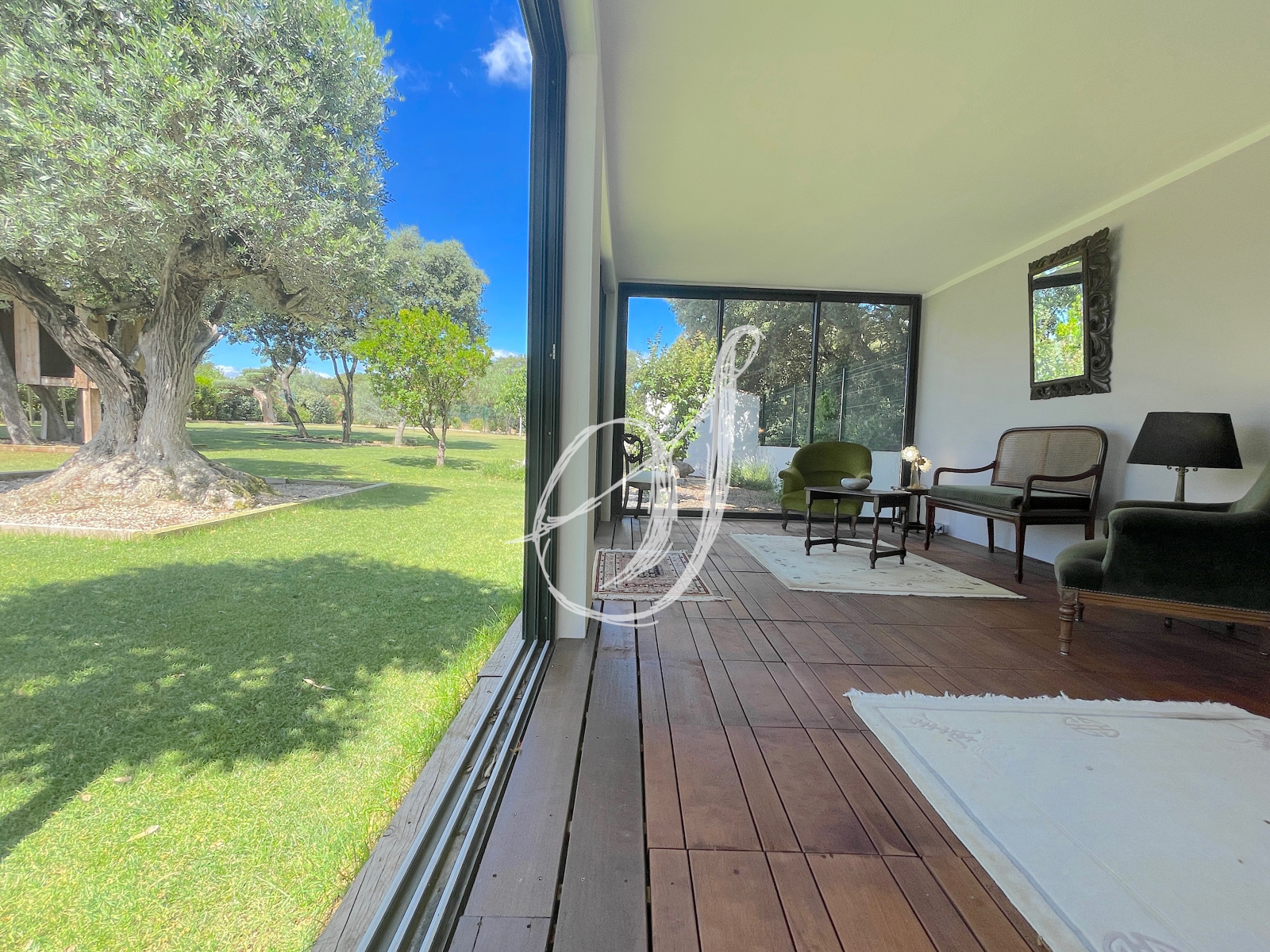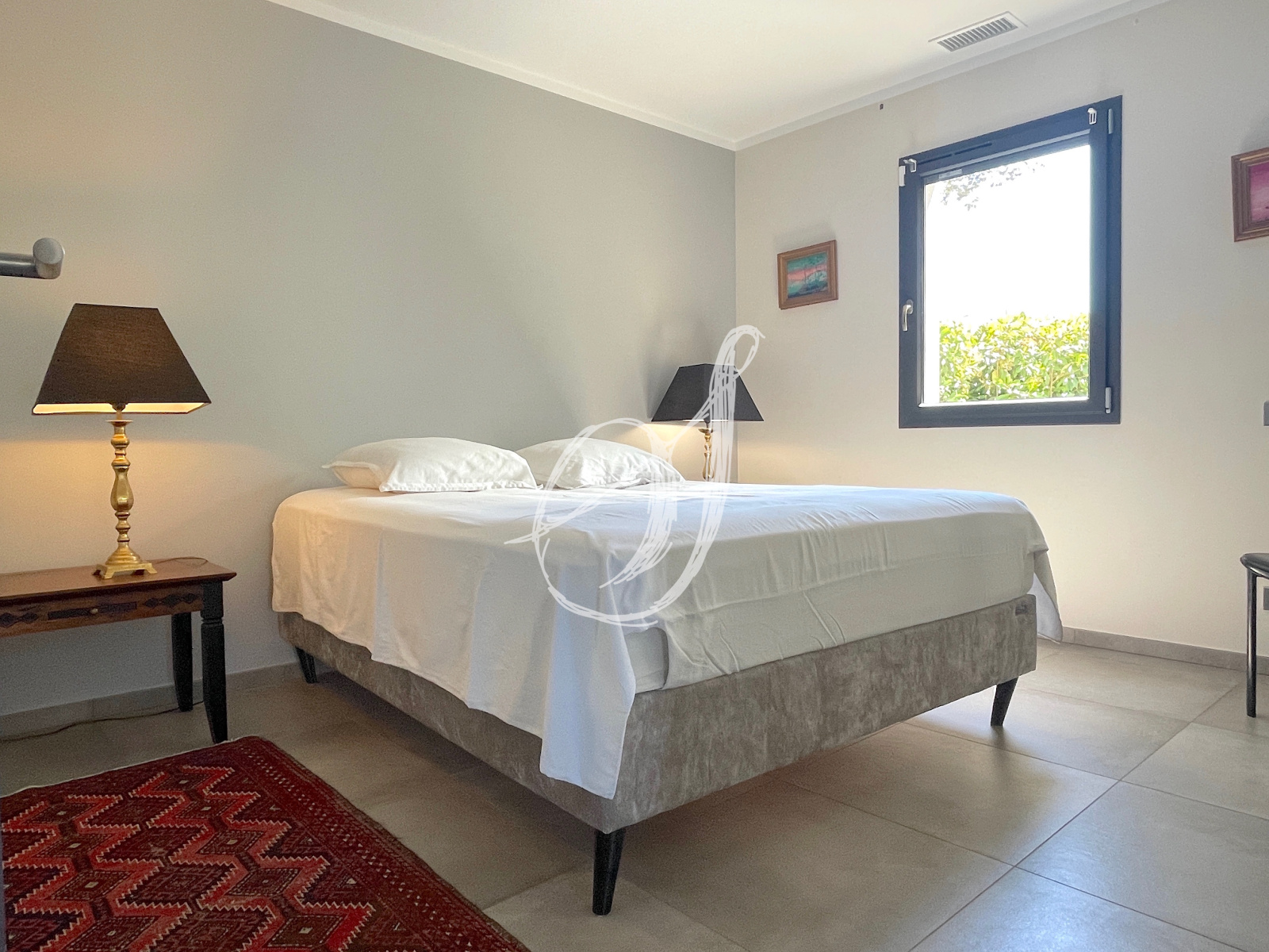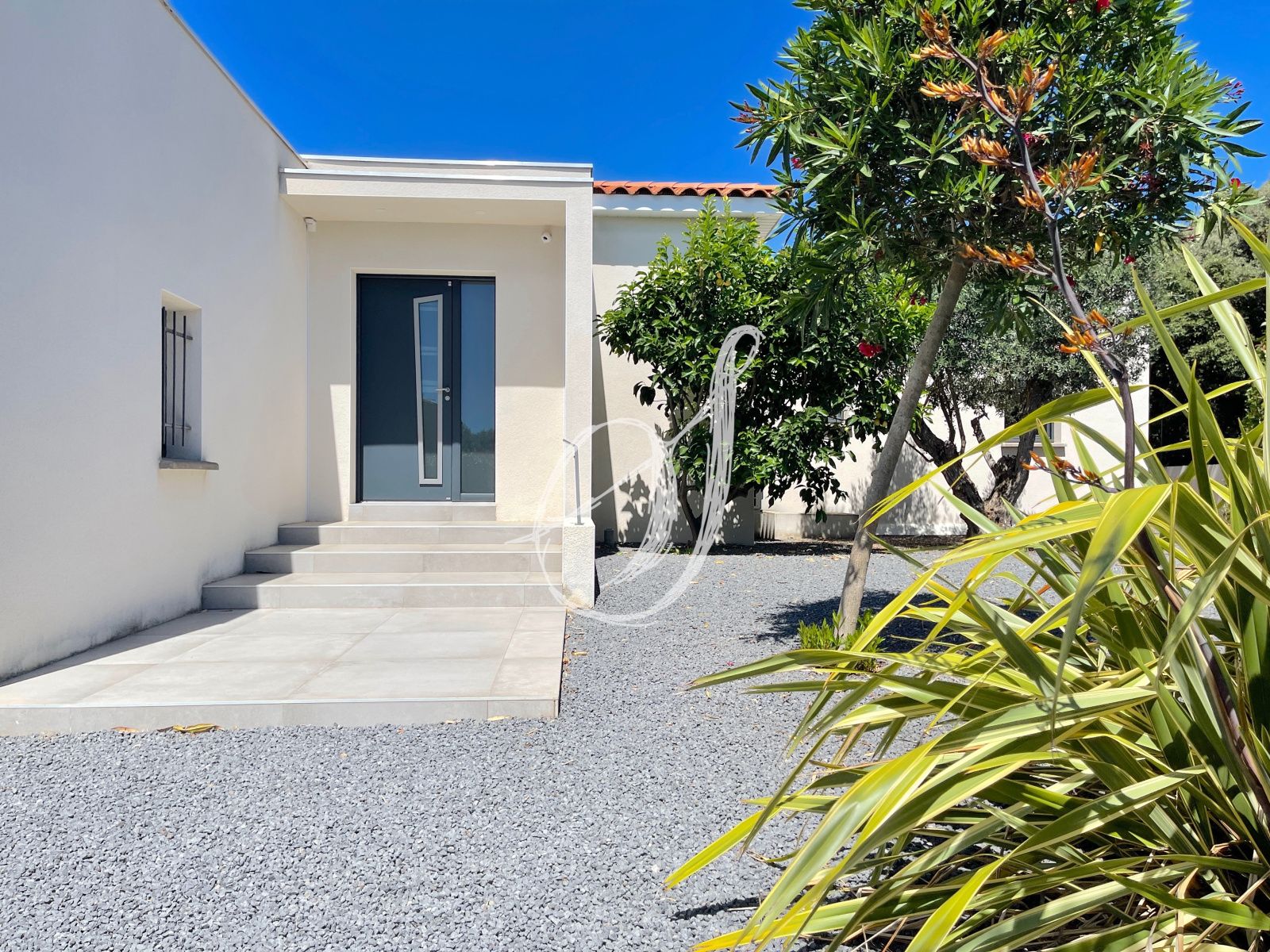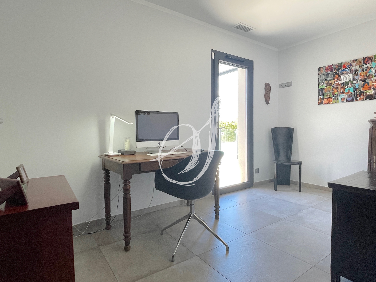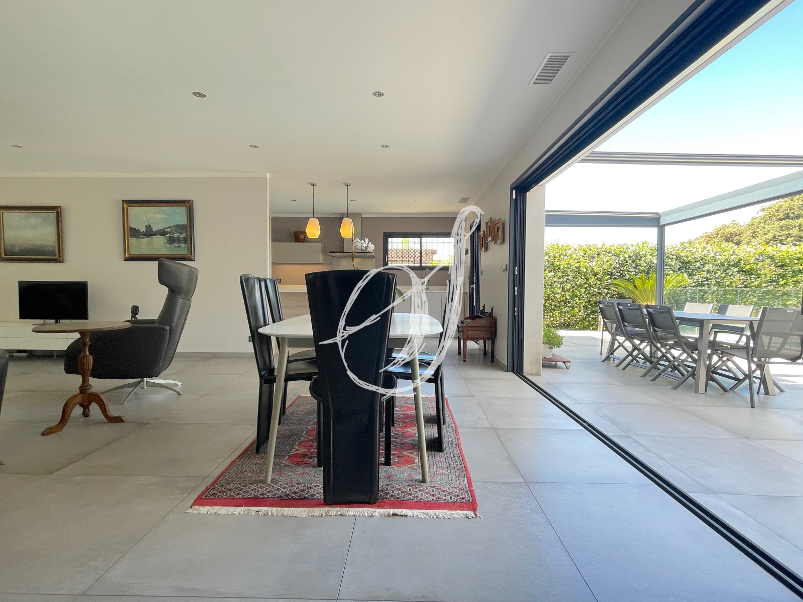Des prestations rares pour cette propriété de standing, sur les hauteurs du village au calme. En bordure d'une zone naturelle protégée & non constructible, cette villa de 2017 labéllisée BBC & RT 2012 est entièrement de plain-pied. Son espace de vie de près de 60 m2 s'ouvre par une large baie à galandage sur terrasse, piscine & jardin entièrement paysagé. Bourré de charme, ce jardin mêle diverses essences nobles : oliviers centenaires, chênes verts, palmiers, jasmin du Japon... Le tout sans aucun entretien : arrosage automatique sur forage & robot tondeuse. Ce bien offre 4 chambres, dont une suite avec dressing & salle d'eau privative, une salle-de-bains. La cuisine haut de gamme de marque allemande dispose d'un cellier communicant avec le double garage. Ouverte sur le jardin, une dépendance aujourd'hui aménagée en salon d'été peut recevoir un espace jacuzzi, une chambre invités, un atelier d'artiste... Un bien impeccable offrant encore diverses possibilités d'évolution en fonction des projets.