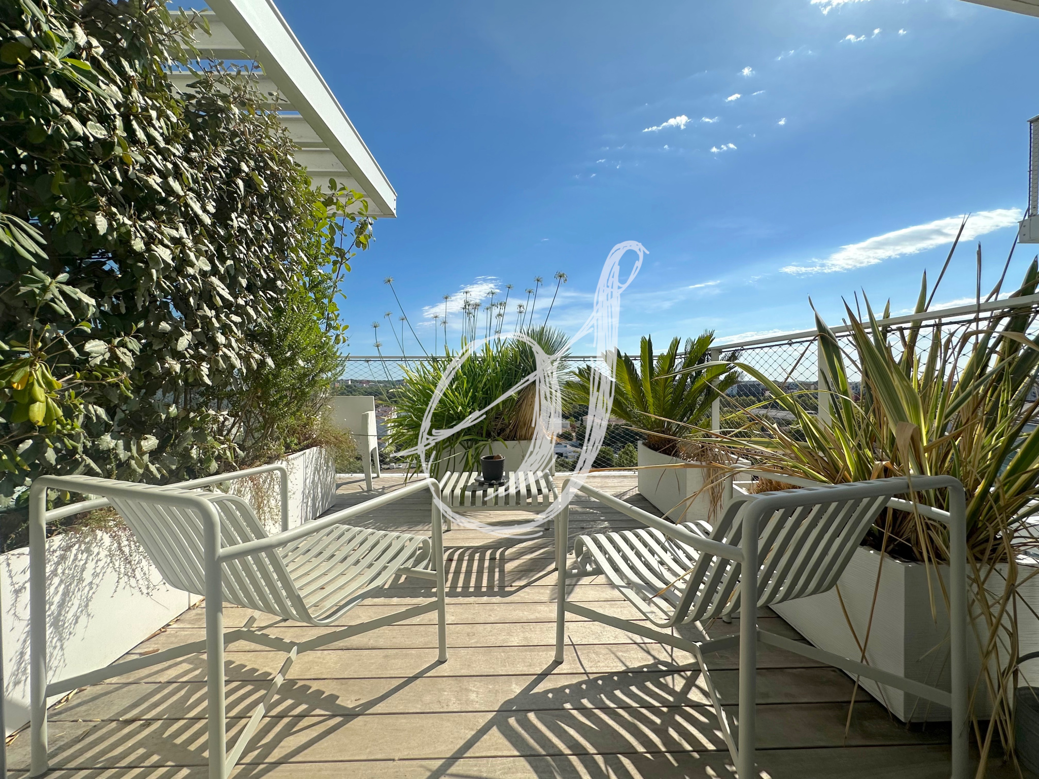 Une Folie Architecturale face au Lez, l'Arbre Blanc est le symbole de la rencontre avec le Japon. Au sein de cette résidence de prestige comprenant une conciergerie, au douzième étage, cet appartement de 115 m2 bénéficie d'une exposition Sud-Est. Son espace de vie de près de 44 m2 offre une vue dominante & dégagée. La cuisine minimaliste de marque Porto Venere s'accorde parfaitement à l'âme du bâtiment & dispose d'un arrière cuisine. Le salon s'ouvre par une large baie sur une première terrasse de près de 20 m2 entièrement végétalisée par un paysagiste. Elle est équipée d'un arrosage automatique. La partie nuit comprend une chambre parentale sur terrasse avec dressing & salle-de-bains privative. Deux autres chambres avec placards se partagent une salle d'eau. Des prestations haut de gamme pour cet appartement : climatisation réversible gainée, parquet de chène massif, entrée & vestibule avec placards. L'appartement est vendu avec deux garages boxés en sous-sol, possibilité de louer un garage supplémentaire. Offrant tous les services grâce à une conciergerie performante, la résidence dispose également d'un rooftop & d'une salle de réception pouvant être privatisés.